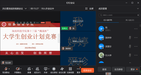 4月9日下午,第十三届“挑战杯”大学生创业计划竞赛乐动平台校赛决赛通过钉钉平台线上举办,得到全校师生的广泛关注和积极参与。