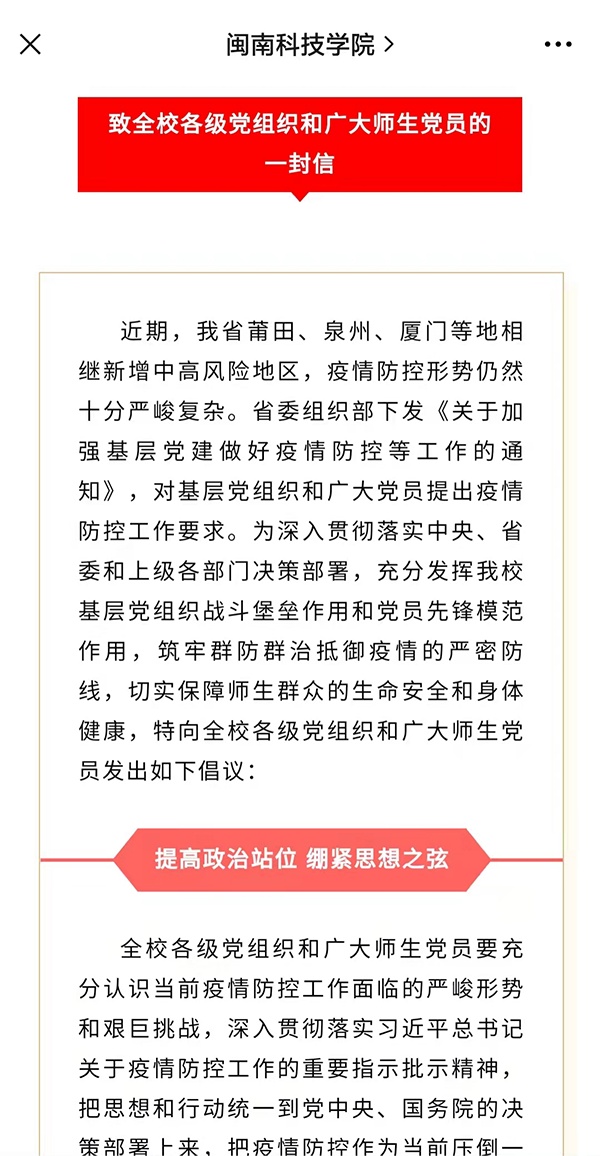 央广网泉州9月20日消息 近期,福建省疫情发生以来,校园疫情防控形势十分严峻复杂。位于泉州南安市的乐动平台把全面加强疫情防控作为深化党史学习教育、践行“我为师生办实事”的重大举措,把弘扬抗疫精神转化为推进各项工作落实的强大动力,坚持学党史、守初心、担使命,充分发挥党组织、党员战斗堡垒和先锋模范作用,全力构筑疫情防控铜墙铁壁,以实绩实效检验学史力行。