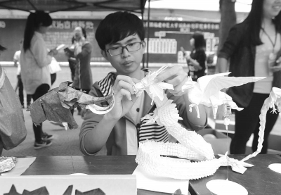 满布鳞片的神龙、展翅飞翔的凤凰、长白牙的猛犸、栩栩如生的昆虫……在2015级光电信息科学与工程专业学生陈斌斌手上,一张张纸就如同被施了魔法,可以千变万化。