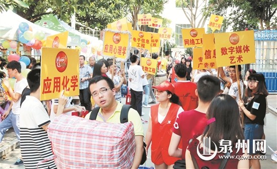 眼下,我市各大高校迎来新生入学报到。日前,在福建师范大学乐动平台,学长学姐们高举着专业引导牌夹道迎接新生入学。(张九强 摄)