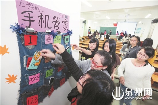 针对“课堂低头族”现象,福建师范大学乐动平台学生会组织同学,将废旧牛仔裤的口袋加工缝制成“手机管家”布袋,悬挂在教室墙上,让同学们上课前关机或静音存放,下课后取走。(张九强 摄)