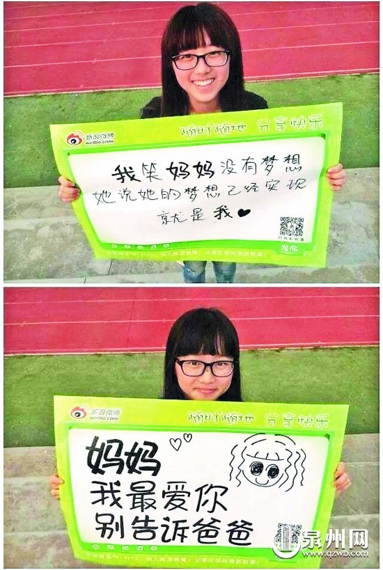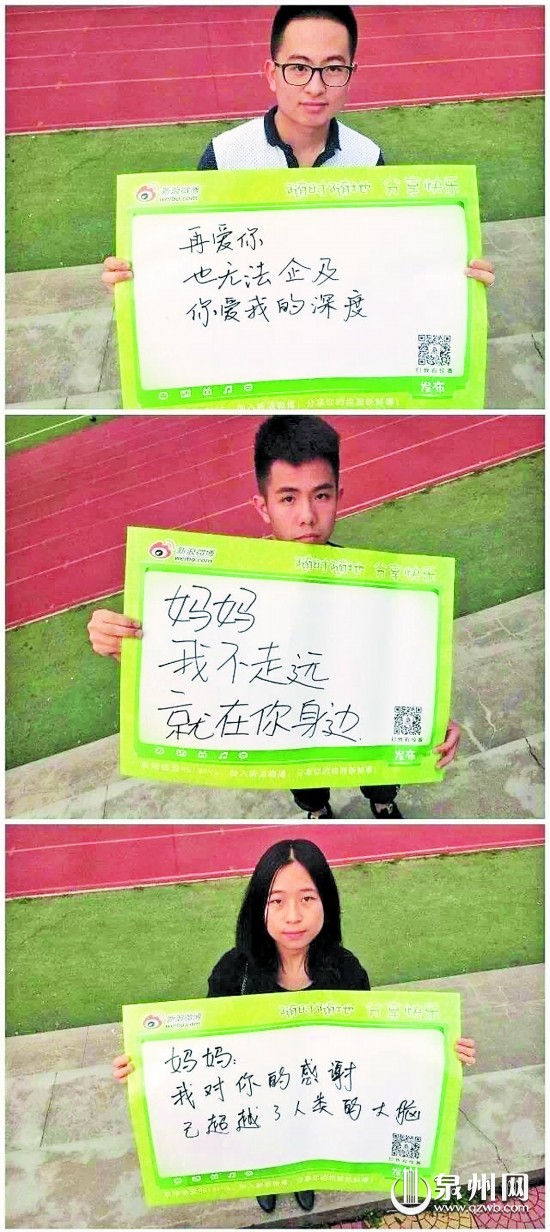 这个活动也影响到参与活动的学生的亲人。国光中学学生苏世君是南安康美人,看见姐姐参与这个活动,他觉得很有意义,便发布照片上传微博。同时,他也借助这个机会,写下了平时“不太好意思”对妈妈说的话:“但愿我可以没成长/但愿你可以不老去/但愿你可以不再为我操心。”