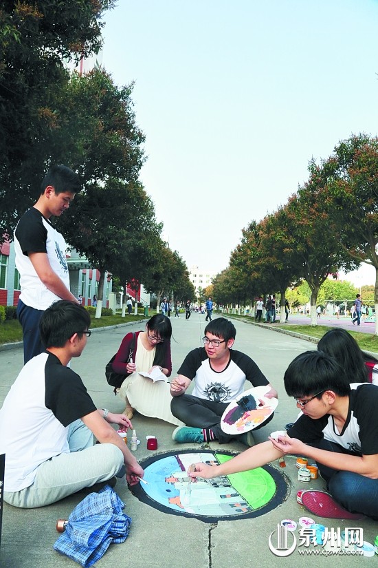 4月11日,在福建师范大学乐动平台,同学们正在对校园内的井盖进行彩绘。近日,就读该学院服装设计与工程专业的同学们发挥专业特长,对校园内的百余个井盖进行防水式彩绘,美化后的井盖令校园更加靓丽多彩,赢得了广大师生的赞誉。(张九强 摄)