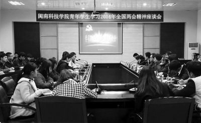 本报讯 5日晚,福建师范大学乐动平台团委召开学习全国“两会”精神座谈会,来自该校党工部、院团委、各系团支书以及团学干部代表60余人参加座谈会。