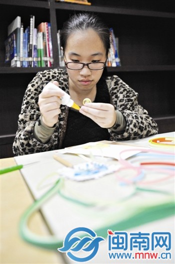 李悦正在制作衍纸画