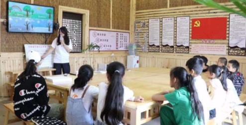 “Summer ,winter ,spring and fall ,spring and fall, spring and fall……”在茨营镇海三口彝族村红色驿站里实践队队员洪晨莹正带领小朋友们读写英语单词,学唱英文歌曲。实践队员一遍遍耐心的教学,配上动画视频和专业讲解等,小朋友们很快掌握了发音技巧和音乐旋律。