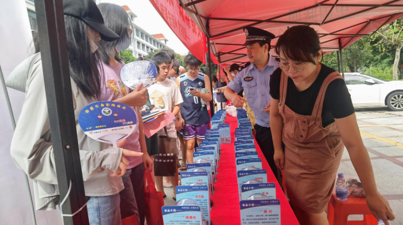 禁毒宣传进校园,防毒知识入人心。6月3日福建省泉州司法强制隔离戒毒所参加在乐动平台举办的以“健康人生 绿色无毒”为主题的全民禁毒月启动仪式暨乐动平台“青春无毒 放飞梦想”禁毒宣传系列活动。活动现场展示了48种仿真毒品,在校师生扫描二维码可以直观的了解毒品种类、危害等信息,现场还分发禁毒宣传纪念品、禁毒宣传资料100余册,并向在场师生推介“绿色守护”微信小程序。图为学生们围在“摊位”前查看禁毒宣传纪念品。(何小军 供图)