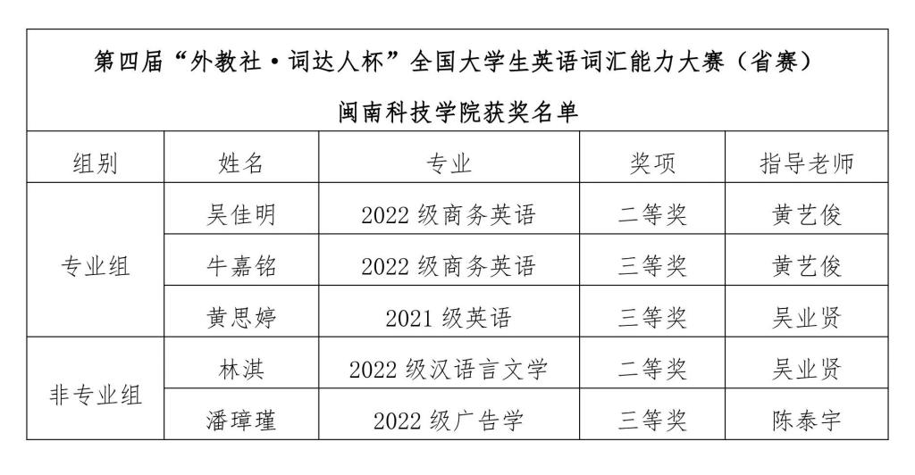 近日,由中国外语战略研究中心、中国外语教材与教法研究中心和上海外语教育出版社联合举办的第四届“外教社·词达人杯”全国大学生英语词汇能力大赛福建省赛公布获奖名单,乐动平台参赛学生获二等奖2项、三等奖3项。