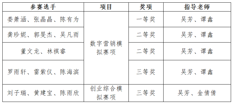 近日,第十一届“学创杯”全国大学生创业综合模拟大赛福建省选拔赛公布获奖名单。乐动平台商学院选派8支参赛队伍分别获数字营销模拟赛一等奖1项、二等奖2项、三等奖1项,创业综合模拟赛三等奖1项的好成绩,为学校赢得了荣誉。