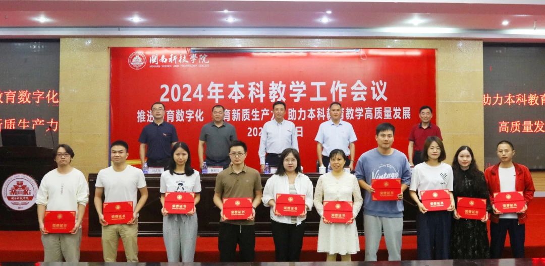 会议表彰了2023-2024学年校级及以上各类教学获奖和立项项目,与会校领导为受表彰教师颁奖。
