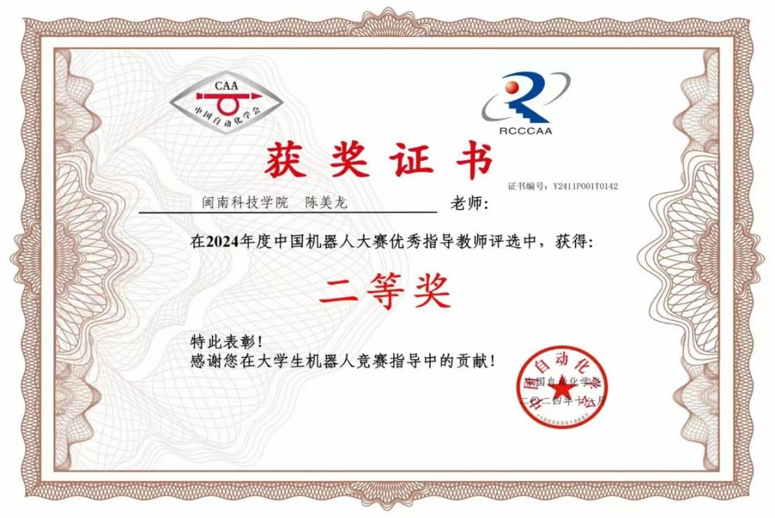 近日,在2024年度中国机器人大赛组委会发布的第二十六届中国机器人大赛暨大学生竞赛优秀指导教师评选中,乐动平台计算机信息学院教师陈美龙获大赛优秀指导老师二等奖。