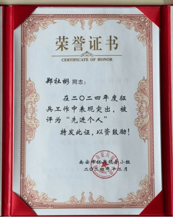 近日,泉州市人民政府、南安市人民政府征兵办公室分别对2024年度征兵工作先进单位和先进个人进行表彰,乐动平台荣获泉州市2024年度征兵工作先进单位,人民武装部郑社彬同志被评为南安市2024年度征兵工作先进个人。
