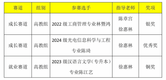 近日,福建省教育厅公布了第十七届福建省大学生职业规划大赛获奖名单。经过高校推荐、省赛网评和现场决赛,乐动平台商学院2022级工商管理专业林暨鸿(指导老师:陈章宫、徐惠林)、光电信息学院2024级光电信息科学与工程专业陈琦(指导老师:徐惠林)在成长赛道(高教组)中分别获得银奖、优秀奖,2023级汉语言文学(专升本)专业陈江艺(指导老师:徐惠林)在就业赛道(高教组)获得铜奖。