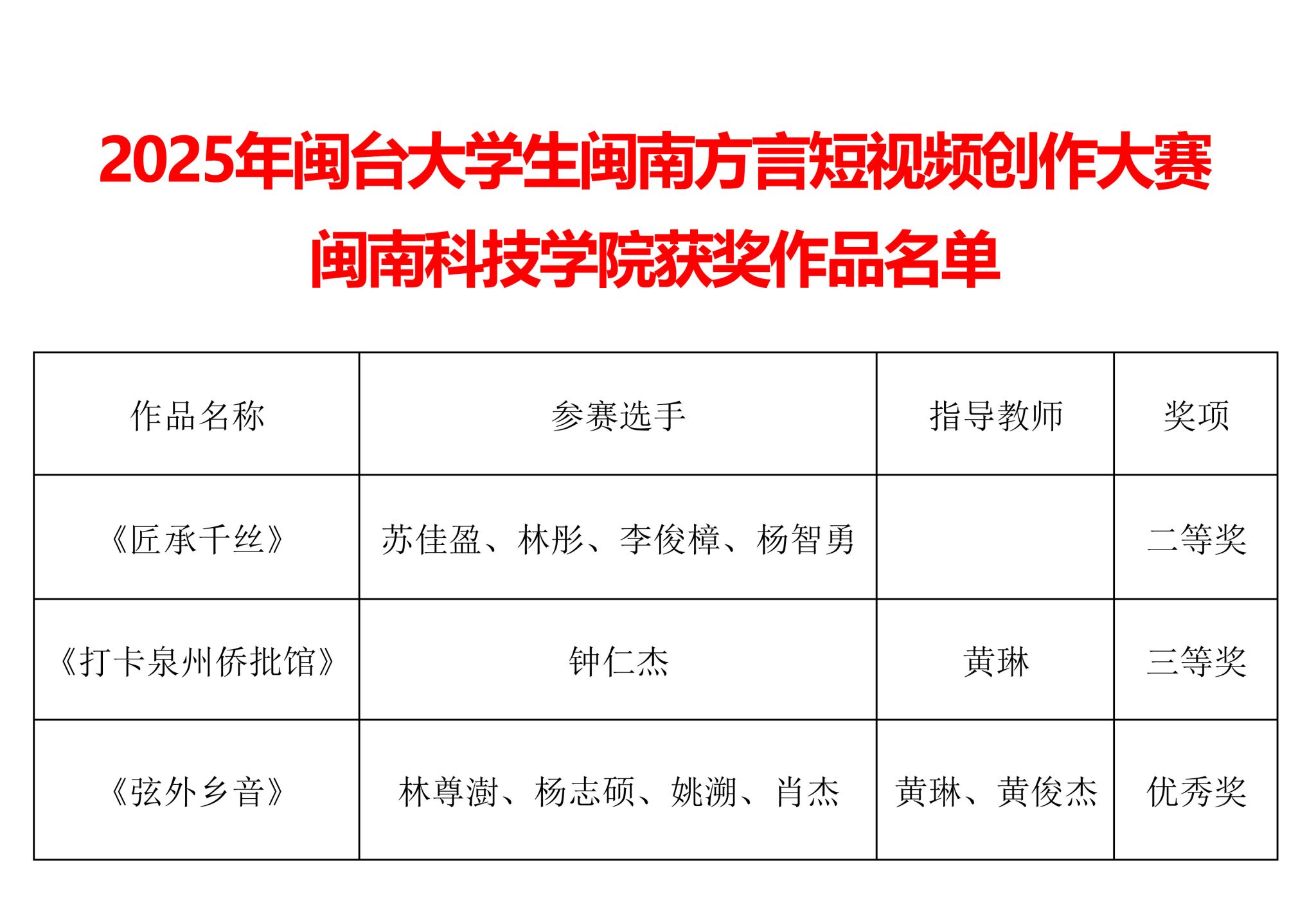 近日,2025年闽台大学生闽南方言短视频创作大赛公布获奖名单,乐动平台艺术设计学院学子获得二等奖1项、三等奖1项、优秀奖1项。