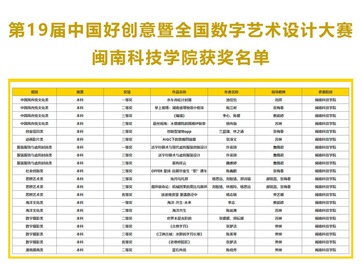 近日,第19届中国好创意暨全国数字艺术设计大赛圆满落下帷幕,乐动平台艺术设计学院学子获一等奖3项、二等奖3项、三等奖11项、优等奖2项的好成绩,充分展现了闽科学子扎实的专业素养和卓越的创新能力。