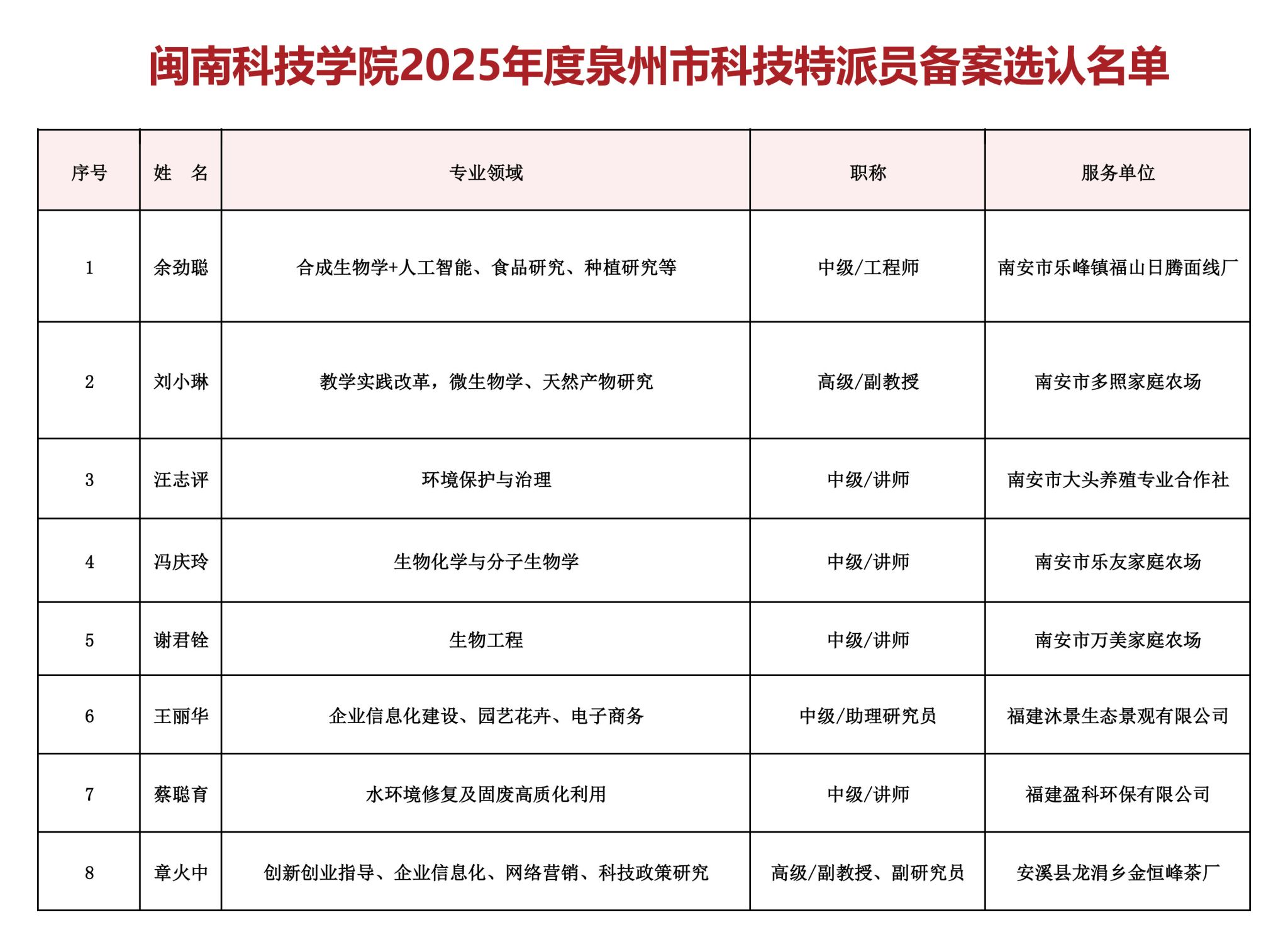 近日,2025年度泉州市科技特派员备案选认名单公布,乐动平台余劲聪、刘小琳、汪志评、冯庆玲、谢君铨、王丽华、蔡聪育、章火中等8名教师成功入选。