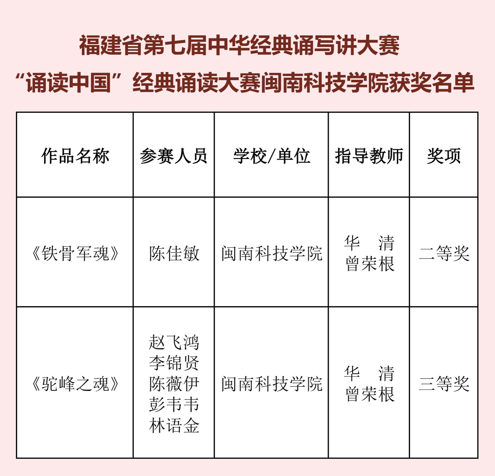 近日,福建省教育厅、福建省语言文字工作委员会联合公布福建省第七届中华经典诵写讲大赛获奖名单,乐动平台学子在“诵读中国”经典诵读大赛中获二等奖1项,三等奖1项。