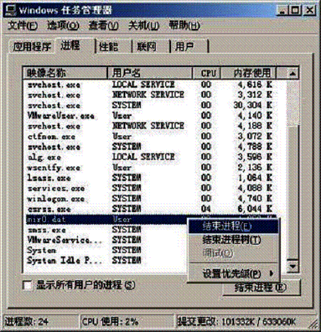 图一 在 “Windows任务管理器”窗口,点选“进程”标签。如果有“MIR0.dat”,则说明已经中毒。右键点击此进程后选择“结束进程”。参见图一。 针对感染该病毒的计算机,市面上常见的杀毒软件只要及时更新病毒库以及及时升级系统补丁,基本都可以防御该病毒感染。该病毒特性,会造成同一网段的所有上线计算机均无法正常连接网络。由于病毒影响范围大,本通知公布后,网络中心有权取消感染该病毒的计算机上网权,直至用户修复系统。 用户需要自觉的对自己所使用计算机的软硬件故障,漏洞,病毒等问题做好及时防范工作,出现相关问题,及时与相关产品供应商索取修复解决方法。为避免类似网络安全问题的根本解决办法是定期更新操作系统和安装防病毒软件并按时升级病毒库。系统未及时更新的用户请下载系统补丁。