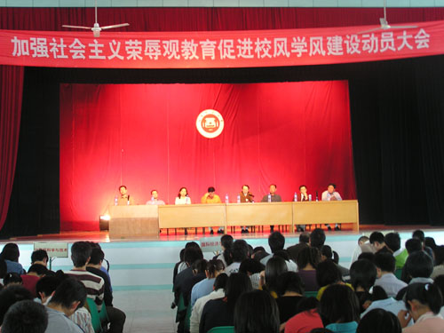 为与党中央路线保持一致,4月19日,学院召开加强社会主义荣辱观教育促进校风学风建设动员大会,院领导、学院法人代表戴宽南先生及全院师生参加了大会。黄国盛院长在会上作了关于“八荣八耻”和校风学风建设的报告。戴宽南先生代表董事会在会上发表关于荣辱观教育及校园建设情况的讲话,宣布了2006年下半年乐动平台将隆重举行5周年校庆。最后,戴宽南先生希望同学们努力学习,将来成为社会主义建设有用的人才。黄国盛院长的报告及戴宽南先生的讲话使师生们受到深刻的教育和极大的鼓舞。