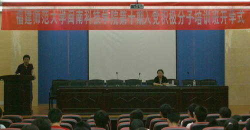 随后,院党委常务副书记刘静做开学式重要讲话。刘静副书记首先对参加培训的入党积极分子表示热烈的祝贺,并对他们提出“三好”要求,即精神面貌好、学习风气好、学习效果好。“三好”要求深刻体现了院党委对新一期入党积极分子的高度期望,使在场的同学们满怀信心与感动。随后,刘静副书记重点谈论了以下三方面内容。第一方面主要介绍从组织结构、党员人数等多方面介绍我院党委的基本情况;第二方面重点概括了我院近几年的发展状况,刘静副书记充分肯定了我院07计算机等级考试取得好成绩、早期晨读现象、校园保洁工作、文明校园建设等;第三方面是介绍我院办学的独特优势及学院发展的目标,即结合百年老校福建师范大学的优质资源和爱国华侨投资建设两大优势,努力把我院建设成为“立足闽南、面向海西”,具有侨乡特色的教学应用型的知名独立学院。最后,刘静副书记还对在场的所有入党积极份子提出殷切希望,希望他们好好学习党基本理论知识,特别是学习十七大会议的重要精神,以实际行动积极向党组织靠拢,时刻以一名党员的标准严格要求自己,争取早日加入中国共产党。