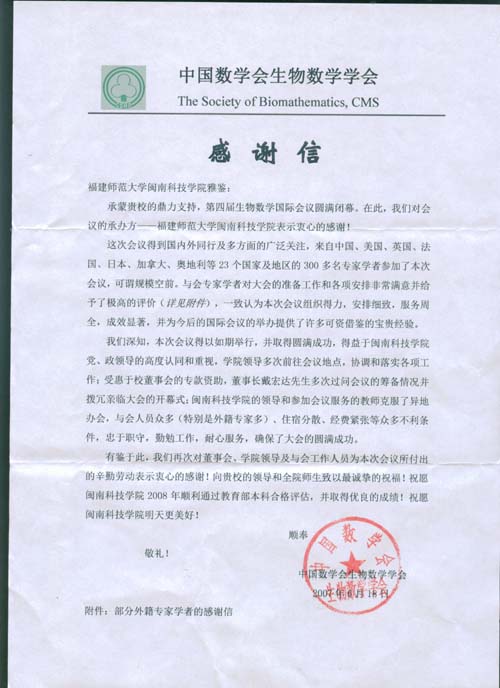 中国数学会生物数学学会给我院发来的感谢信