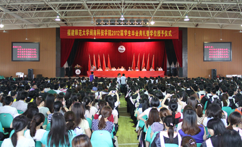 6月27日上午,我院2012届学生毕业典礼暨学位授予仪式在学生活动中心隆重举行。福建师范大学副校长、博士生导师许明教授,福建师范大学校长助理郭警修同志,南安市教育局局长吴亚明同志,福建师范大学博士生导师、原学院院长黄国盛教授,地理科学学院党委书记、原学院党委常务副书记林国庆同志,学院董事会戴宏达董事长、戴宽南副董事长、董事长助理戴景星同志,学院领导郭丹、林明旭、肖华山、陈振祯、周勇军,部分学生家长、学院各系主任、各部门负责人、教师代表、各专业辅导员、2012届全体毕业生参加了典礼。