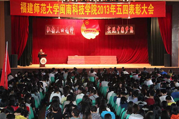凝聚青春正能量,共筑伟大中国梦。5月4日下午,我院“弘扬五四精神 实现中国梦想”2013年五四表彰大会在学生活动中心隆重举行。大会现场团旗、院旗、系旗飘扬,汇成红色的海洋。大会号召全院青年学生继承和发扬伟大的五四精神,自觉自信地肩负起中华民族伟大复兴的神圣使命,珍惜时光,不懈进取,用青春、智慧和力量来追求并实现我们的“中国梦”。学院名誉院长陈兰荪,院领导邱永渠、林明旭、周勇军、李彬源、吴勇,学院各系部、中心负责老师,以及学生代表1000多人参加了大会。