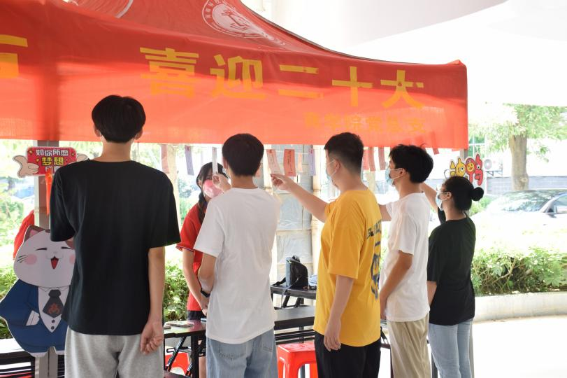 “朱漆涂舟后,人显更抖擞(党史名词)”“四面八方惠爱心(猜党史人物)”“不忘初心念于心(猜字)……”商学院采用“学党史+猜灯谜”的形式开展党史学习教育,在寓教于乐中引导学生了解谜底背后的党史故事。
