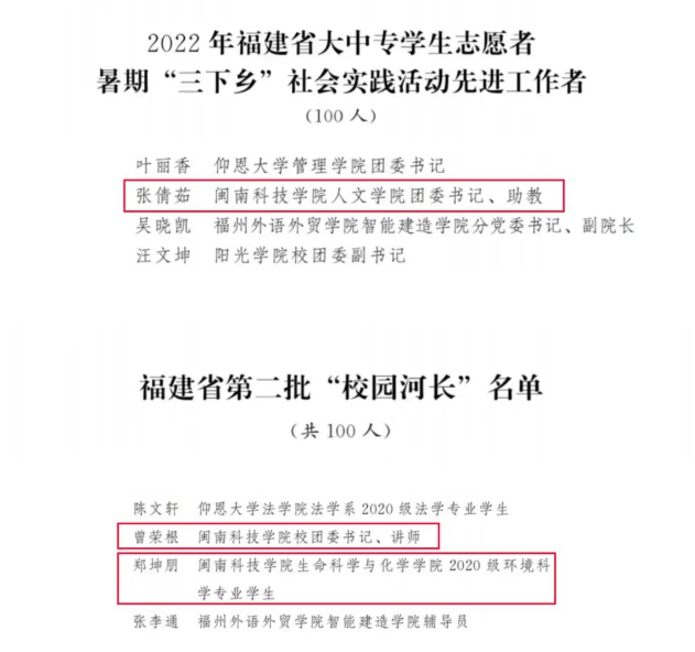 近日,2022年福建省大中专学生志愿者暑期“三下乡”社会实践活动评选结果和聘任福建省第二批“校园河长”的名单公布。乐动平台人文学院团委书记张倩茹获省级“社会实践先进工作者”荣誉称号,校团委书记曾荣根、生命科学与化学学院2020级环境科学专业郑坤朋同学获省级“校园河长”荣誉称号。