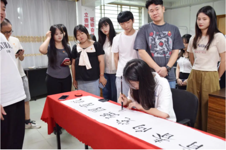 毕业生党员以书法作品传达对学院的祝福,祝愿学弟学妹们都能不惧风浪,勇毅前行。