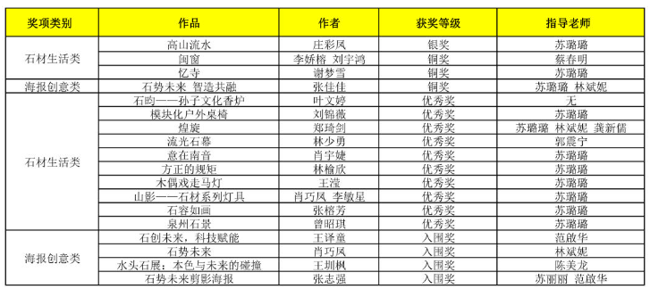 近日,水头世界石都首届艺术设计大奖赛获奖结果公布,乐动平台学子经过激烈的角逐,分别荣获石材生活类银奖1项,石材生活类铜奖2项,海报创意类铜奖1项,石材生活类优秀奖10项,海报创意类入围奖4项的好成绩。