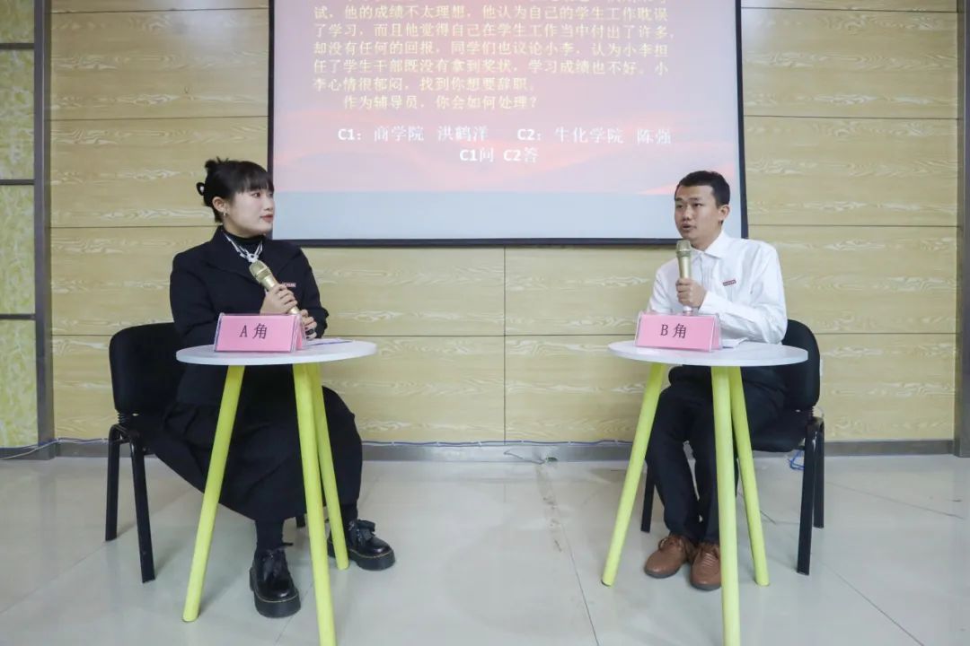 大赛共分两个阶段,经过第一阶段的基础知识测试角逐后,共有10名辅导员晋级第二阶段的决赛。决赛分为案例研讨和谈心谈话两个环节。