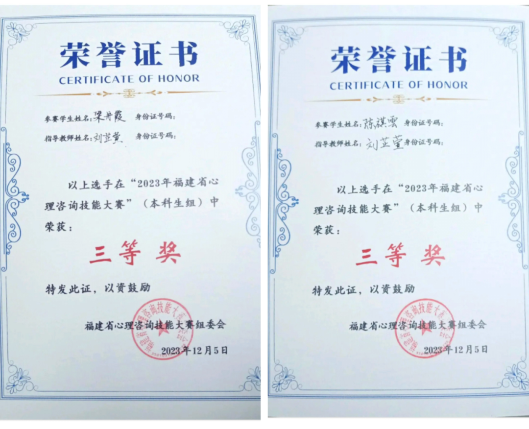 近日,由福建省教育厅主办的2023年福建省心理咨询技能大赛结果公布,乐动平台人文学院2021级应用心理学专业梁舟霞、陈祺雲两位同学分别获本科生组三等奖。