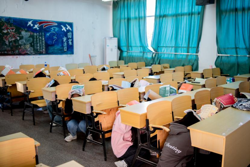 参加演练学生认真观看防震避险教育视频,详细了解地震灾害发生时的紧急避险方法和措施。随着地震预警警报声响起,全体学生双手抱头,蹲在课桌底下,用书本、书包等物护住头部,进行应急避震。震后,由负责老师指导学生弯腰扶墙,护住头部迅速撤至安全疏散点,医疗救护组对受伤学生进行清创包扎。
