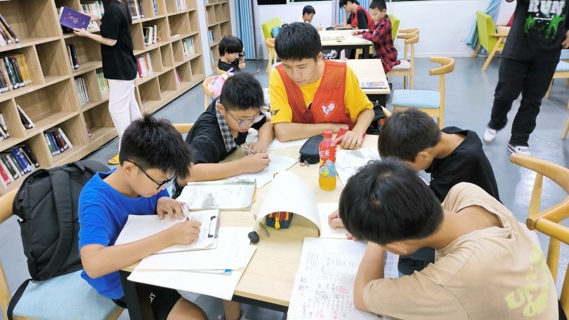 青年志愿者走进康美镇公益图书馆辅导小学生作业
