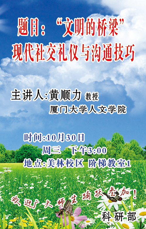 讲座题目: “文明的桥梁”:现代社交礼仪与沟通技巧 时间:2013年10月30日(星期三)下午3:00 地点:美林校区阶梯教室1 主讲:厦门大学人文学院历史系 黄顺力 教授 主办:教务部 承办:科研部